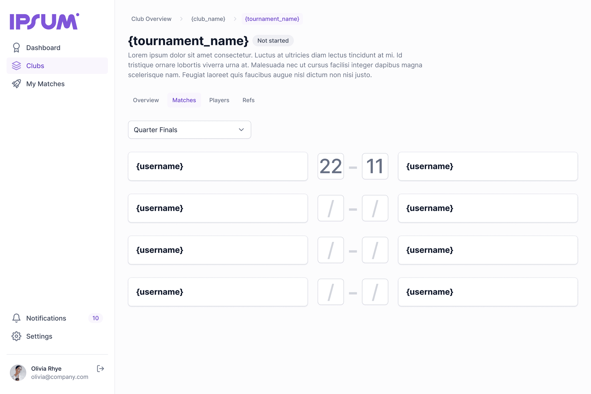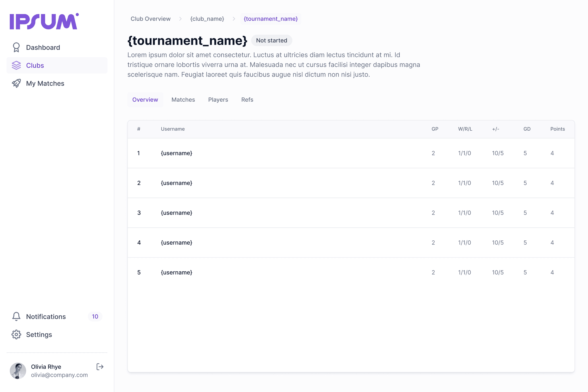 When opening a tournament, users can see its full details, including the current state, rankings, stats, matches, players, and referees.