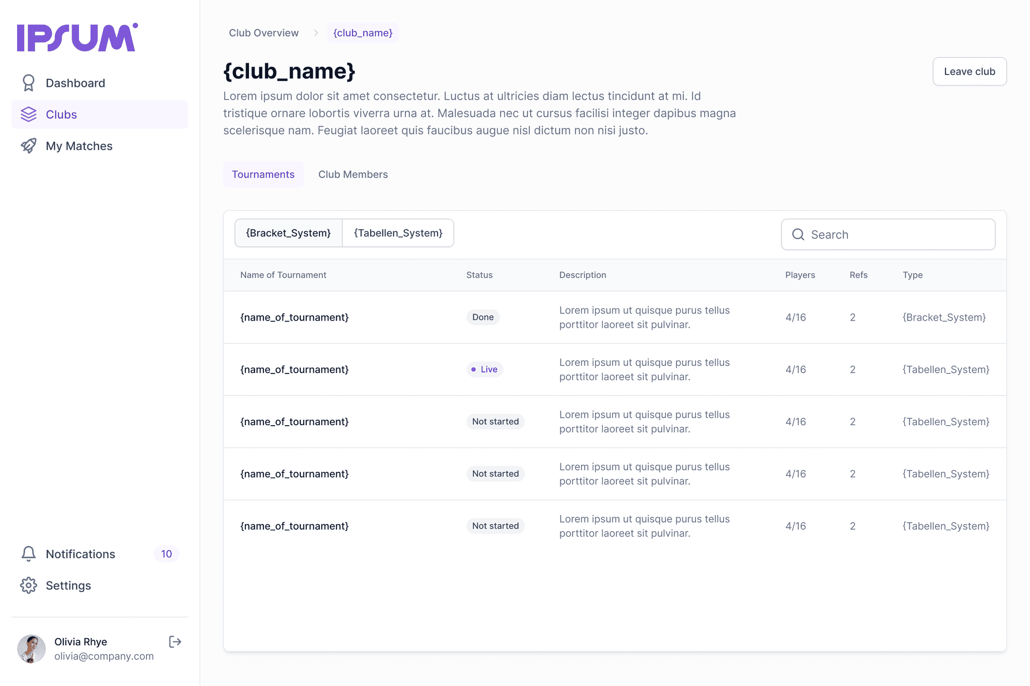 By selecting a club, users can access all its details, such as ongoing tournaments that can be filtered by type. They can also see the list of club members.